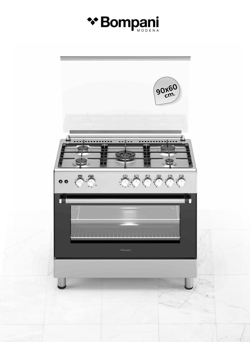 Bompani 90x60cm 5-Burner Cooking Range with Mechanical Timer, Gas Oven, Grill, FFD, Full-Safety, Automatic Ignition – One Year Manufacturer Warranty BO693YAL Silver