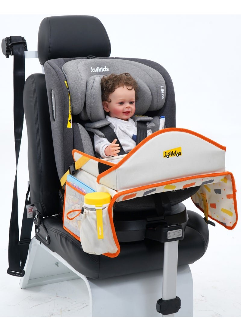Jovikids Car Seat Travel Tray for Kids – Foldable Travel Table with iPad Holder, 7 Storage Pockets, Drawing Surface, Adjustable Strap & Educational Travel Desk | Road Trip Organizer for Children – Beige