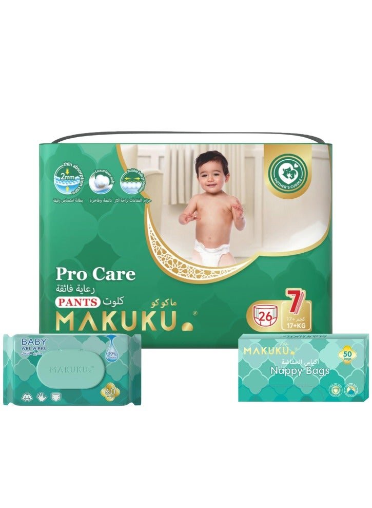 Makuku Diapers Pro Care Pants Size 7 XXXLarge And Wipes With Nappy Bags For Baby Unisex 26 Diapers + 60 Wipes + 50 Bags