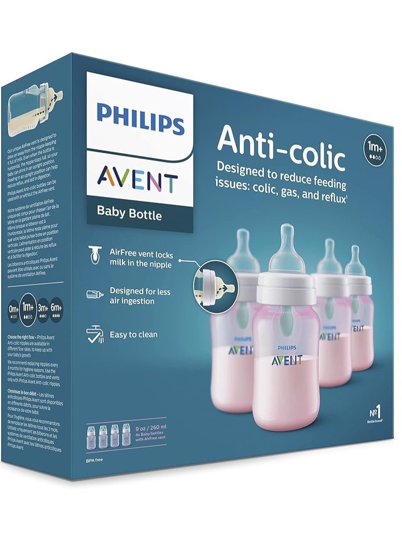 Philips Avent Anti Colic Baby Bottles with AirFree Vent, 260 ml, Pack of 4, Pink, 1m+
