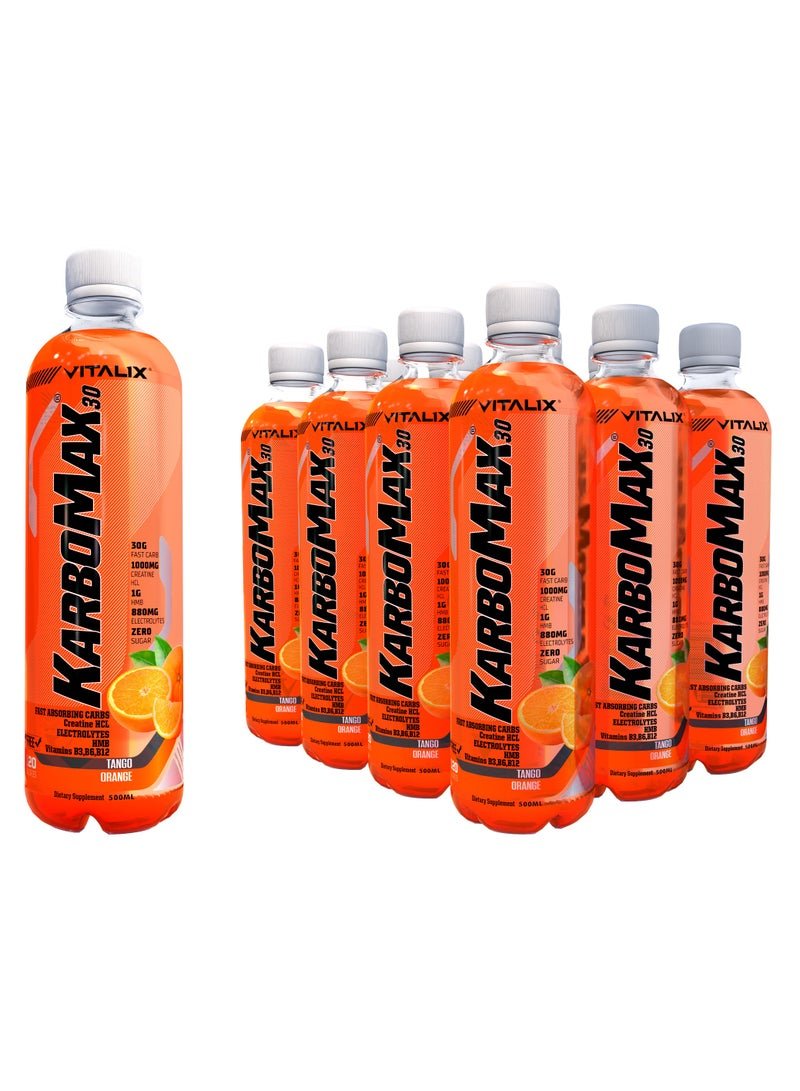 Vitalix KarboMax 30 Tango Orange – Fast Carb Drink with 30g Carbs, 1000mg HCL Creatine, 1g HMB, 880mg Electrolytes, Vitamins B, Zero Sugar, 500ml Pack of 12